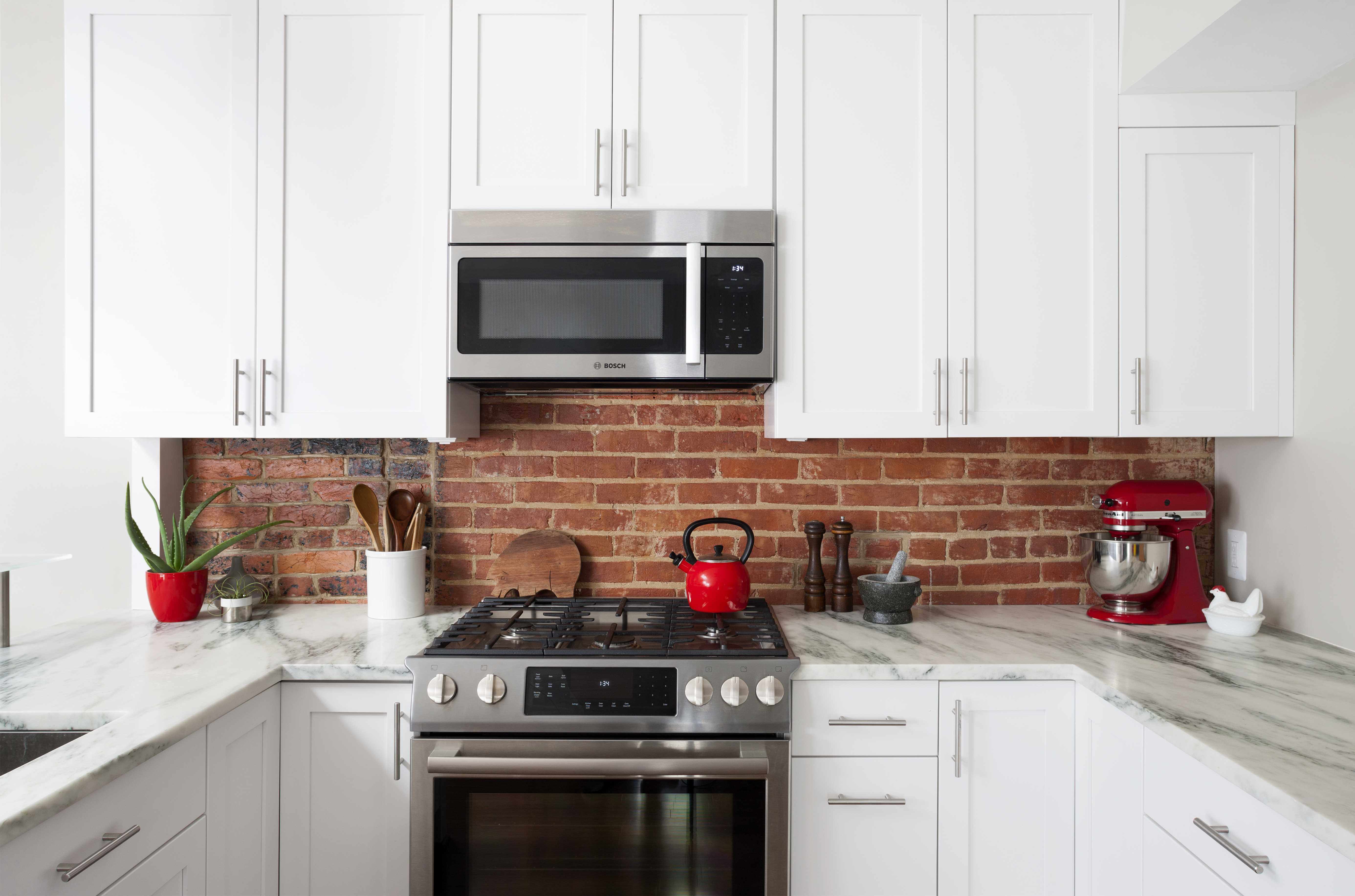 White Kitchen Cabinets With Red Brick Backsplash : To make your white kitchen cabinets truly pop, you need the perfect backsplash.. The dark wood flooring works well, but the kitchen minimalist modern red kitchen design with red backsplash and white countertops, ceiling and walls. Accent tips for white kitchen cabinetry. You could simply refer to this as the red and. If you're getting white cabinets crafted from wood you should need certainly to give particular attention to them. Give your cabinets a complete makeover using the existing cabinets boxes, adding new.